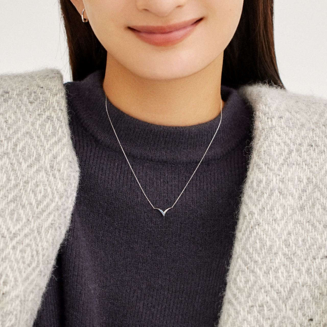 地金のラインとアイスブルーダイヤモンドで冬のカスケード(小滝)を表現したネックレス。凛としたリッチな印象がポイントです。