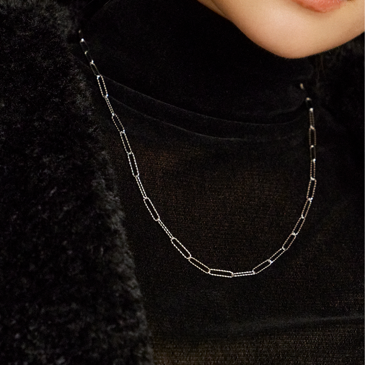 純プラチナのひねりを入れたトラック型のパーツが連なるモダンな印象のネックレス。このネックレス1点でも存在感があり、コーディネートを華やかにしてくれます。
