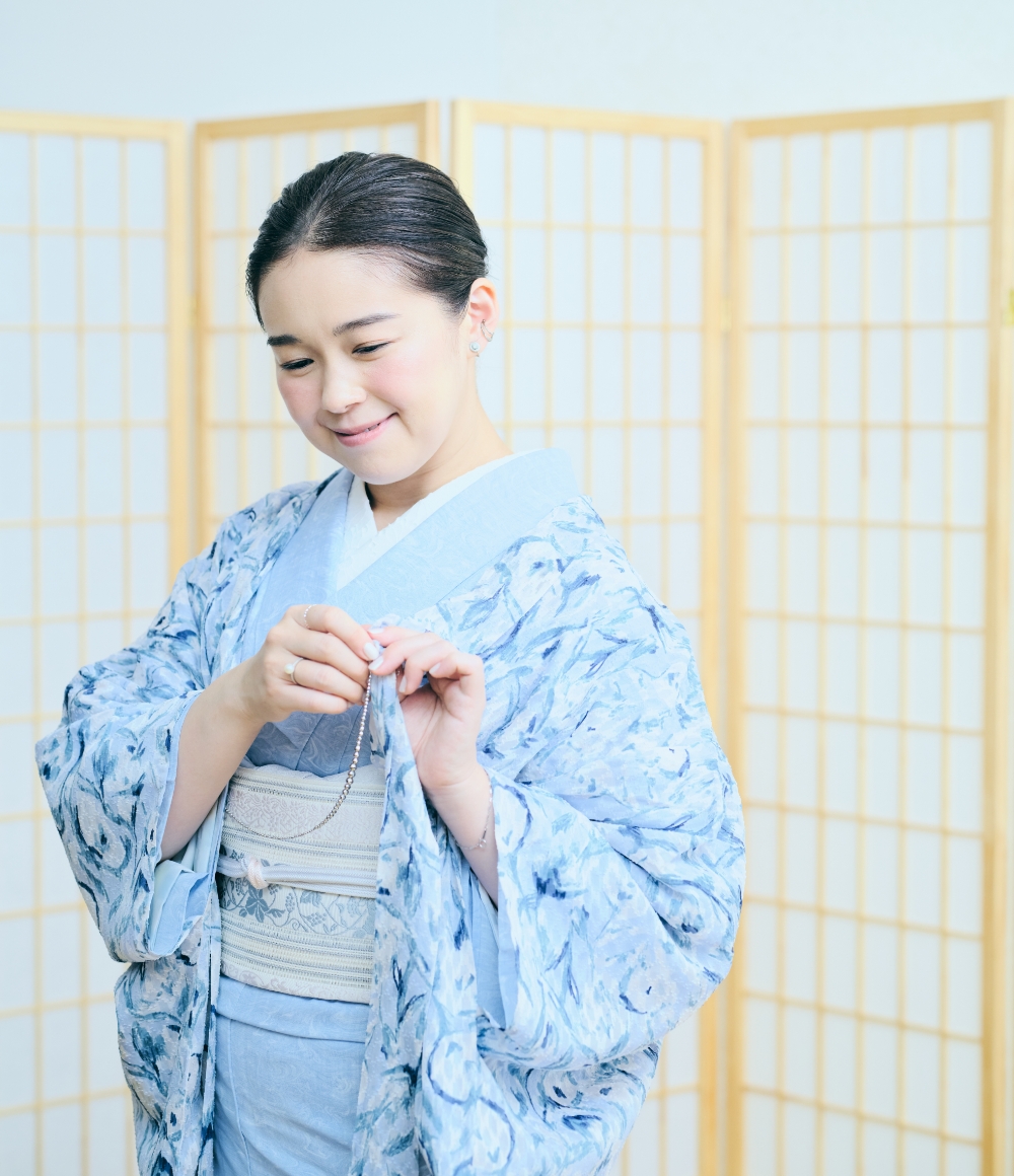 爽やかな着物にプラチナのジュエリーが加わると、さらに華やかになりますね。普段も着物にジュエリーを合わせることはあるのですが、着物の美しさが映えるよう、耳元のイヤリングなどさりげなく着けることが多いです。