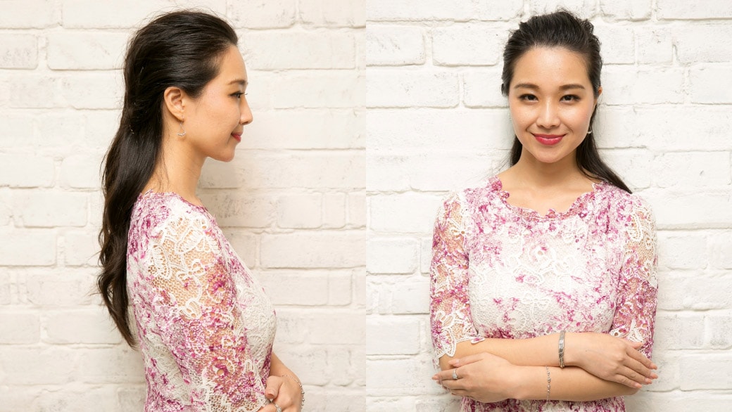 「大振りなドロップ型のダイヤモンドペンダントでカジュアルをクラスアップしました。普段なかなかつける機会のない華やかなプラチナ・ジュエリーも、意外とカジュアルにも合うんだな、と新発見。リングやピアスなどたくさんつけても、さらりとかっこよく決まるのがプラチナの魅力ですね。ヘアスタイルは普段からアップスタイルが多いのですが、後ろを編み込みにしたユニークなまとめ髪も、カジュアルをアップデートしてくれてよかったです」(鈴木さん)